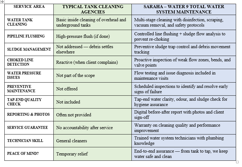 Most clients pay for tank cleaning and pipeline wash, yet still adjust with low water pressure, choked lines, or dirty tap water. This defeats the purpose of maintenance. With SARAHA’s AMC, you pay once and stop adjusting — we take responsibility from source to tap.