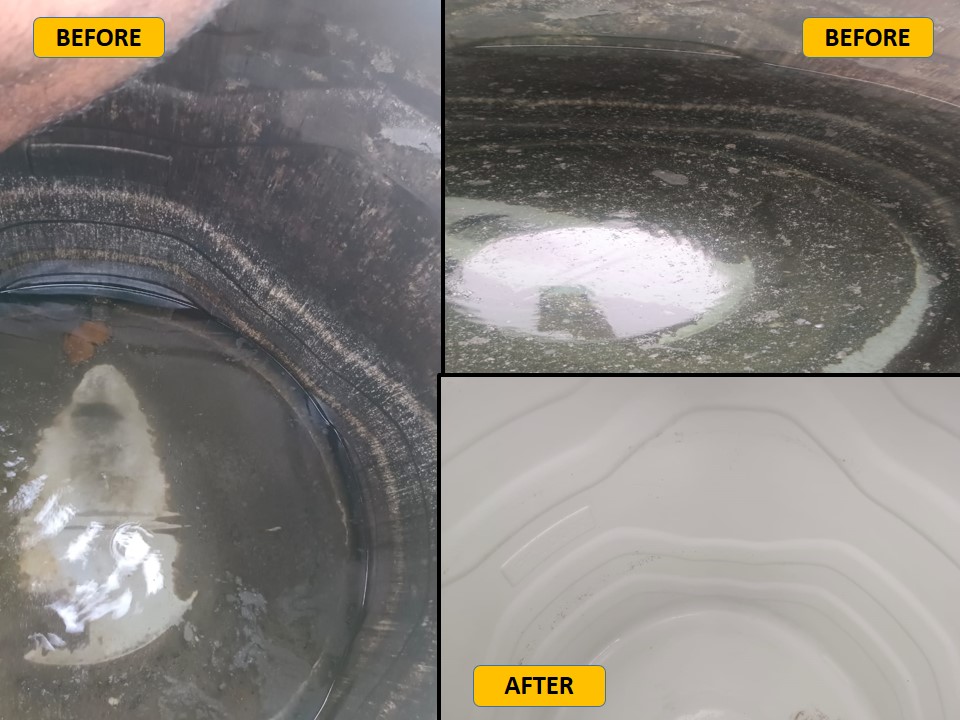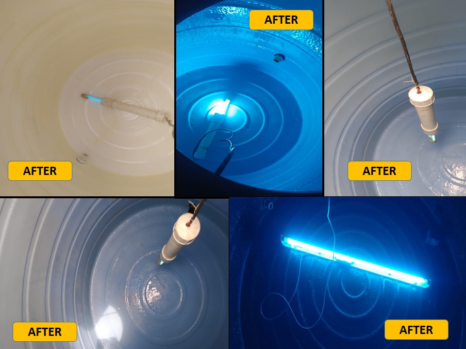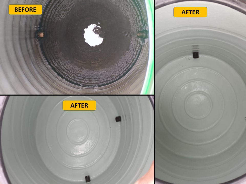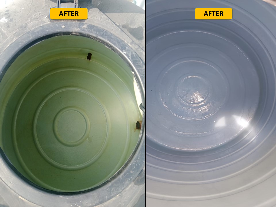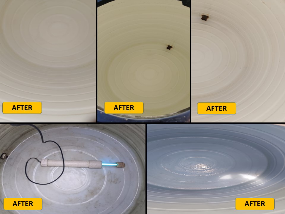 Wasted Money: Any amount spent on manual cleaning is just a mental satisfaction — no real hygiene benefit. Use of Harmful Chemicals: Commonly used acids, bleach, and detergents are not food-grade and can harm skin, eyes, hair — especially in kids and elders. Incomplete Cleaning: Hand scrubbing cannot remove hidden sludge, biofilm, or bacteria effectively. No UVC Disinfection: Without UVC treatment, dangerous germs remain — your water stays unsafe. No Long-Term Benefit: Dirt re-accumulates quickly due to improper methods, requiring frequent, ineffective cleanings.